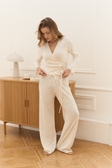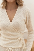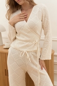 Теплий вʼязаний кардиган на запах із завʼязками, облягаючого фасону, з хвилею на рукавах та по низу.
