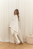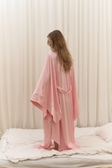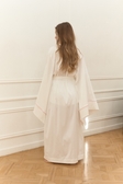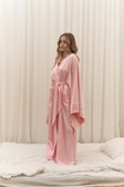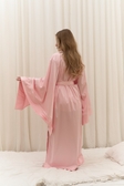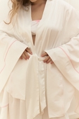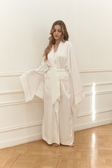 Ніжне кімоно з кантом у довжині максі, вільного фасону. Широкі рукави з розрізами та оздоблені кантом. Кишені оздоблені кантом. По боках кімоно має високі розрізи. Широкий пояс йде у комплекті. Представлено в єдиному розмірі, підійде на обхват до 106 см. Довжина 140 см